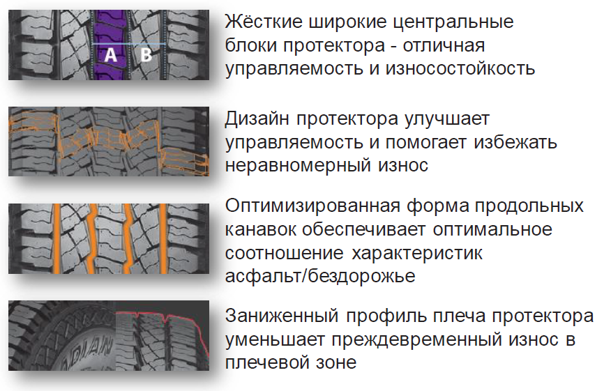 - Надёжная конструкция — внутренней каркас шины оптимизирован для эксплуатации с автомобилями, имеющими высокий центр тяжести, а износостойкий компаунд обеспечивает высокую ходимость при интенсивных нагрузках.